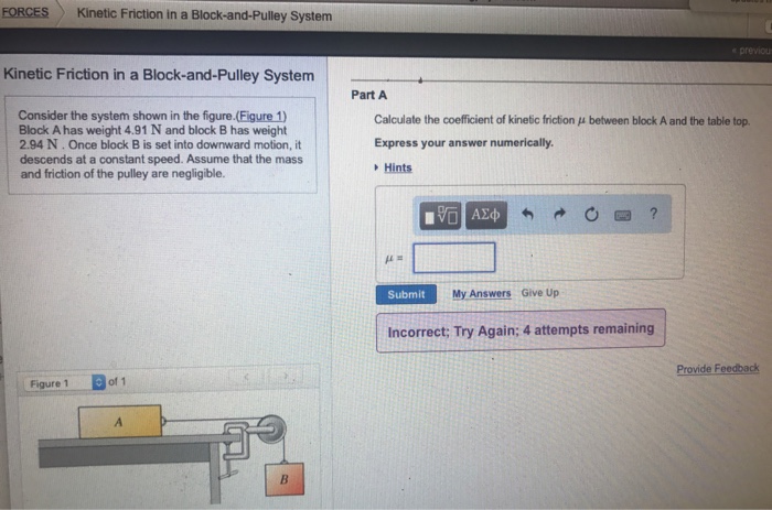 In this experiment since the coefficient of kinetic friction is to be measured all cases of constant speed motion of the block must be accompanied by tapping the incline. End data recording before the block hits the pulley. Block A has weight w_A and block B has weight w_B Once block B is set into downward motion it descends at a constant speed. A cat also of weight w_A falls asleep on top of block A. Taking downward as the positive direction for the hanging mass the acceleration will be Acceleration ms² With this acceleration the tension in the rope will be. Two blocks one on a table and one hanging are connected by a pulley. The coefficient of kinetic friction between the block of mass m 2 and the table is 0. Consider the system shown in the figure. There will be static friction involved for cases.